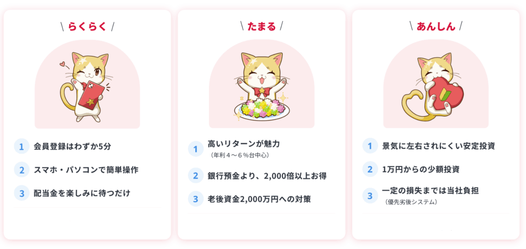 投資家保護の仕組みがしっかりしていて、安心した投資が行える🥹すごいサービスだよ~~