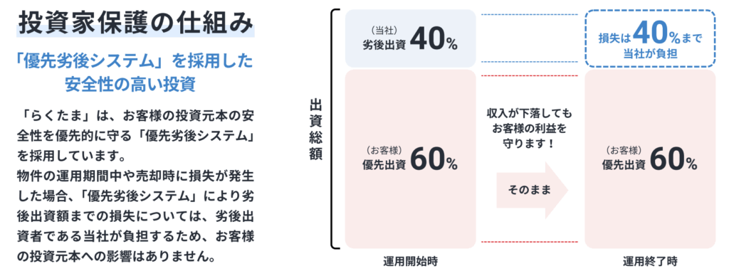 最初に運営会社(らくたま側)が自分のお金(劣後出資)で損をカバーしてくれるの。