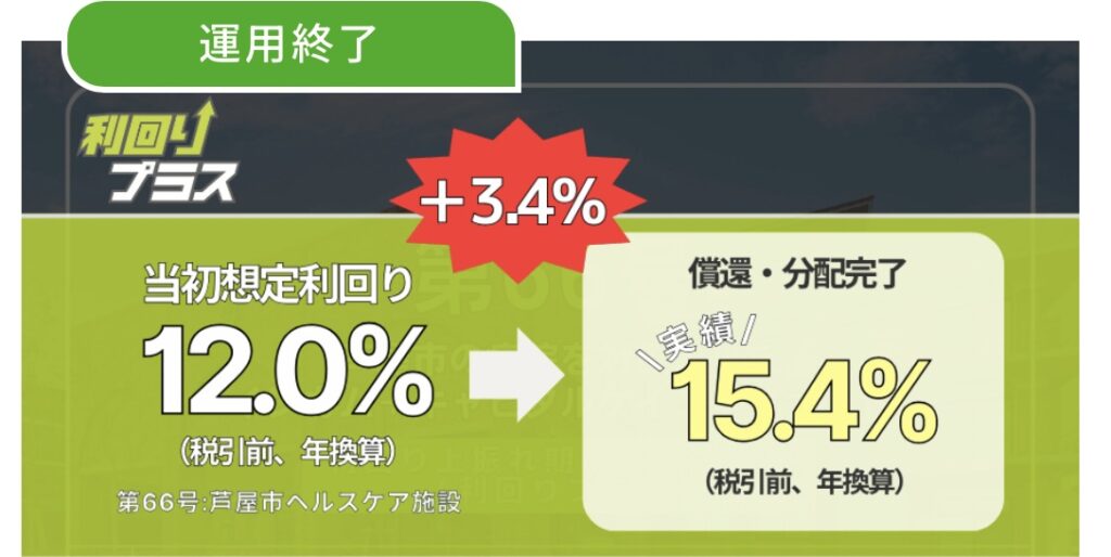ちなみに第66号ファンド投資した時は3.4%上振れして、15.4%になったよ!